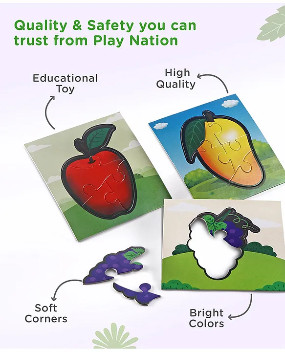 3 in 1 Fruits 12 pcs Colorful Jigsaw puzzleMontessori Educational Pre School Toy for Cognitive DevelopmentBIS Certified12 months+ Features:Contains three separate jigsaw puzzles in one set, each featuring a different fruit-themed design.Puzzle consists of 3, 1 & 5 pieces, making them suitable for young children to learn and scale up.The puzzles feature bright, colorful images that area engaging and visually appealing to young children.The pieces are large enough to prevent choking hazards and are designed with smooth edges to ensure safe play for kids.Specifications:Brand – Play NationType – PuzzleAge – 2 Years+No.of Pieces – 12Box Dimensions – L 23 x B 15 x H 4 cm
