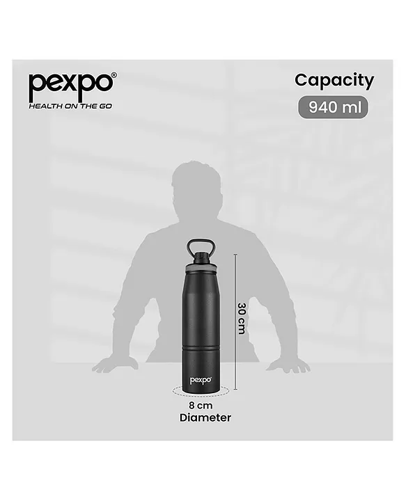 Altros Pro Stainless Steel Hot & Cold Vacuum Insulated Flask, 940ml, Knight Black Leak Proof Easy to Carry Loop Handle Sports Water Bottle Trekking Gym Office Home Limited RCB Edition Features-Technology: TPVT Tri-Ply Vacuum Technology for temperatureretention (keeps drinks hot or cold)Leak Proof: YesBPA Free: YesISI Certified: Ensures safety standardsWarranty: 1-Year Manufacturer Warranty Product Specifications-Brand: PexpoType: FlaskCapacity: 940 mlColor: Knight BlackCap Type: Sipper CapAge Group: Above 3 YearsProduct Weight: 518 gProduct Dimensions: 7.5L X 7.5B X 29.5H CMPackaging Dimensions: 8.0L X 8.0B X 30.0H CM Material: Food Grade Stainless Steel Description-Introducing the Pexpo Altros StainlessSteel Water Bottle, your ultimate companion for all-day hydration needs! Ourbottle features advanced tri-ply vacuum insulation technology (TPVT), keepingyour beverages hot or cold for extended periods. The convenient sipper capmakes on-the-go hydration effortless. Crafted from premium 304 stainless steel,the Pexpo Altros ensures durability, safety, and reliable performance. Itssturdy handle adds to its portability, making it ideal for daily commutes orexciting adventures. But wait, there’s more! The Pexpo Altros come in avariety of colors and sizes. Choose your favorite color and size to match yourstyle and preferences. Looking for a perfect birthday gift? Look no further!The Pexpo Altros Stainless Steel Water Bottle is a delightful present foranyone, regardless of age or gender. Its blend of elegance and functionalitymakes it a cherished gift for every occasion. Stay hydrated in style with thePexpo Altros Stainless Steel Water Bottle. Choose your favorite size today!