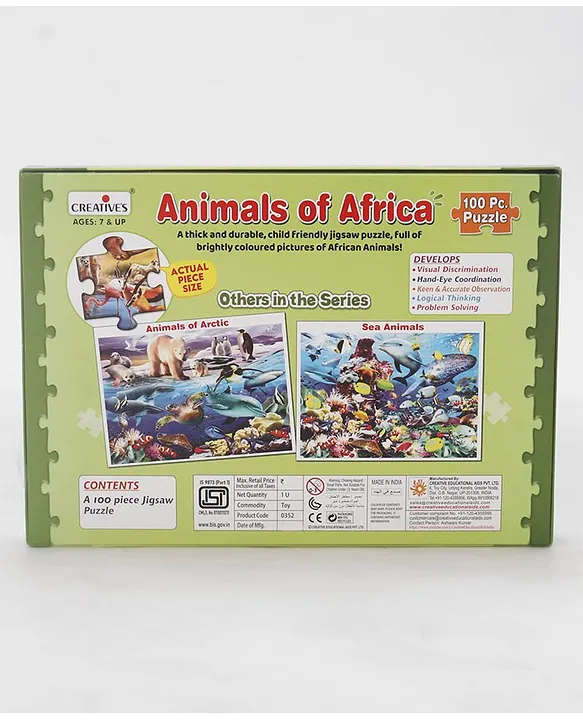 Animals Of Africa Jigsaw Puzzle Multicolour 100 Pieces Features:Specifically designed for children ages 7 & Up years, this puzzle perfect for children & adult.The Puzzle are perfect for quiet time or travel games for kids in car, plane or take out to restaurant or picnic, can easily play at anyplace or anytime. The puzzles for toddlers are great gift choices for a birthday and other holidays.Develops skills like Visual Discrimination, Hand-Eye Coordination, Keen & Accurate Observation , Logical Thinking & Problem SolvingSpecifications:Brand – CreativeType – Jigsaw PuzzleAge – 7 Years+Box Dimensions – L 35.5 x B 25.5 x H 4 cmWeight – 590 g