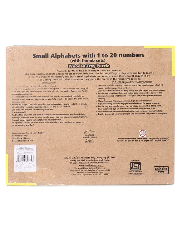 Introduce small alphabets & numbers to your little ones the fun way! Easy to play with and fun to learn!! It teaches children to identify and learn small alphabets, numbers and their correct sequence by associating them with their shapes as they place the pieces in the respective cavities. Precision crafted, brightly coloured, attractive puzzle pieces which fit exactly in their respective cavities! Well placed thumb cuts for easy lifting and placing of the puzzle pieces. Puzzle tray provides a firm and stable base. It forms the basis of their constructive learning and visual learning. The product is made of non-toxic wooden material, for the convenience and safety of children.