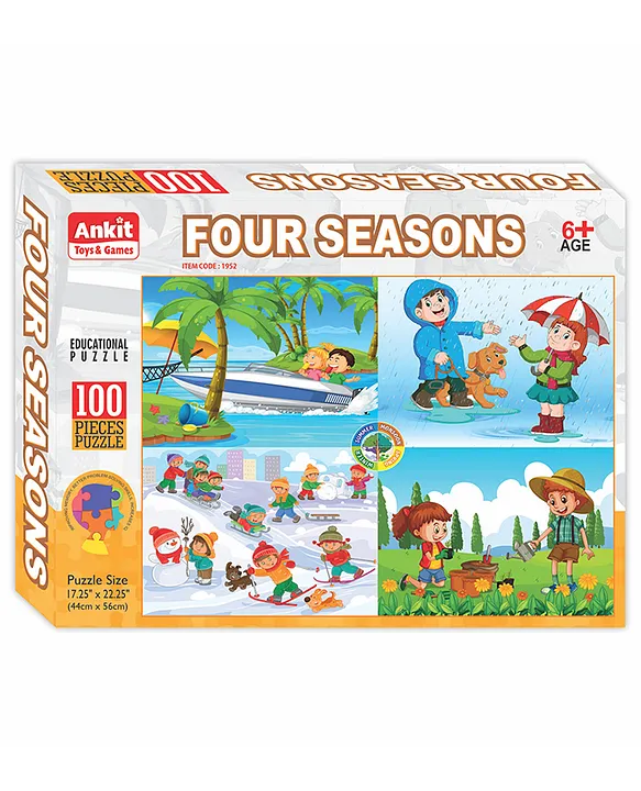 Ankit Toys Four Seasons Educational Jigsaw Puzzle for Kids Jumbo Pack Multicolor 100 Pieces Features :Helps to develop Shape, Colour, and Letter Recognition skillsHigh quality product with no sharp edges and 100% safe for your childChildren will develop hand-eye coordination and fine motor and problem-solving skillsBest gift for birthday, Diwali, return gift or any occasion and in schools, tutios, play area by teachers and studentsBIS Certified-The product complies with BIS Standards to ensure the safety