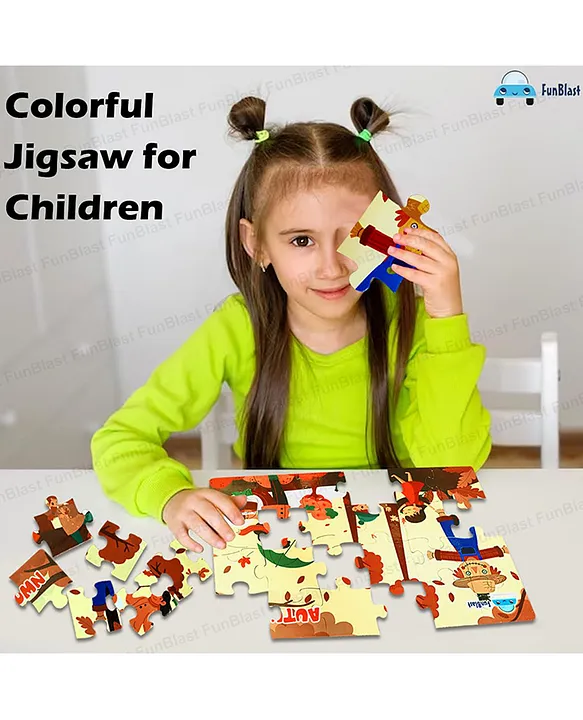 Product DescriptionFunBlast Jigsaw Puzzle The piecesare of high quality to endure a toddler’s handling. Assembling Fun Play Jigsaw – Thesejigsaw puzzles come with a box which makes toddlers easy to assemble puzzle ina frame and is an ideal place to keep pieces safe, together, and free fromdamage. These autumn season theme jigsaw puzzles will help to improvekids ?Hand Eye Coordination, Color Recognition, Creative Thinking,Concentration Skill and many more. The greatest attraction of FunBlast jigsawpuzzle is that it allows kids to calm down and learn to think independently. ColorfulArtwork – Kids will love learning and solving different thematic puzzles withfun & illustrations. Are you looking for aperfect gift for your kids? This jigsaw puzzle will be a unique gift idea. ThisFunBlast Autumn Season theme jigsaw puzzle can be considered as the best returngift, birthday gift, can be gifted on any suitable occasion.
