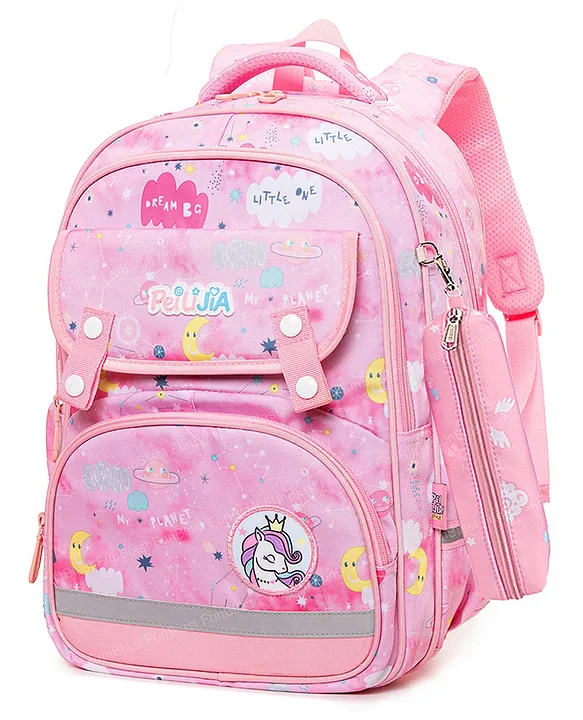 Bunie Unicorn Theme Large Capacity School Backpack with Pouch for Girls Pink 15 Inches FeaturesThis beautifully designed backpack comes with zipper closure,side pockets & spacious compartment to keep your carrying books, writing material, lunch box, and water bottle.Lightweight backpack, Orthopedic shoulder bag for a picnic,travel & outdoor bag.Comfortable Shoulder Straps with Adjustable Feature.There are padded back mesh and ergonomic straps that gives extra spine and shoulder support.It helps in minimizing the load for added comfort and convenience to hold the bag.Best Stationery Gift Birthday gift for kids, Return gift for students, School Prizes, can be gifted on any occasion.