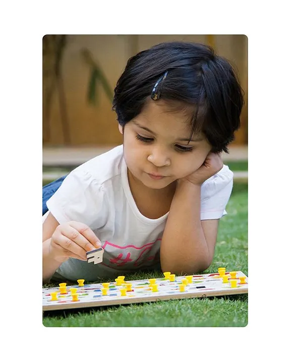 Children will love identifying capital alphabets with their corresponding objects, while they develop motor skill. Can be used for learning spellings. Each wooden letter is 4 mm thick. Also available in lower alphabets with a different set of objects. Made of MDF, it uses non-toxic inks that are 100% child-safe. Provides an initial introduction to alphabets and digits. Helps in developing further understanding of complex mathematical equations and language & writing.These alphabet tray with pictures have knobs for easy removable of alphabets.