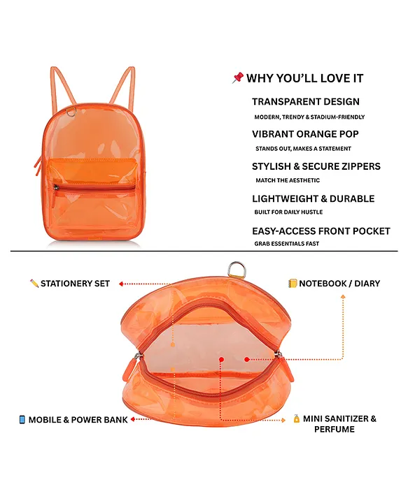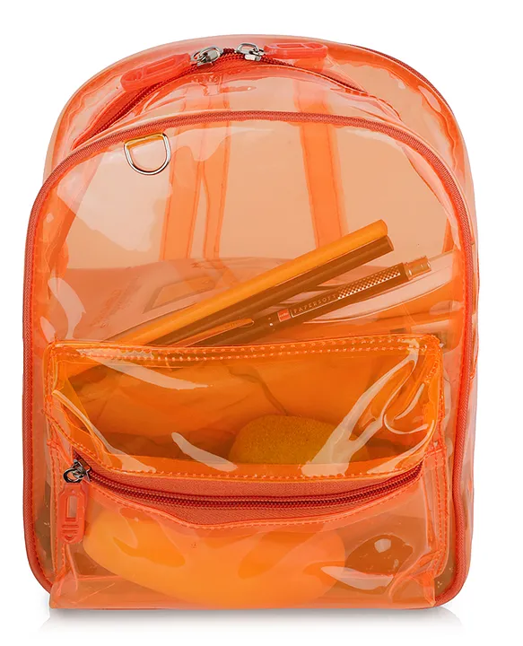Stylish Transparent Design: Eye-catching neon orange clear bag that adds a trendy touch to everyday use.Durable PVC Material: Made from premium waterproof PVC that is strong, flexible, and easy to clean.Spacious & Functional: Large main compartment with ample space for books, notebooks and essentials, plus a convenient front zipper pocket.Perfect for Multiple Uses: Ideal for school, travel, picnics and casual outings.Lightweight & Comfortable: Adjustable shoulder straps ensure hassle-free carrying for kids.