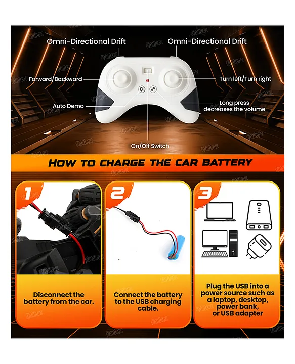 Product Description:Get ready for non-stop fun with the Fiddlerz RC Double-Sided Stunt Car! Designed for high-speed action, this multicolor car comes in vibrant orange and green variants, making it even more exciting for kids. It features 360° spins, sideways drifting, and epic flips to amaze both kids and adults alike. The durable build and shockproof tires ensure it conquers any terrain, from indoor floors to outdoor rough surfaces. With a powerful 2.4GHz remote, kids can race multiple cars at the same time without interference. The rechargeable battery provides long-lasting play, making this a perfect gift for adventure-loving kids. Watch it spin, drift, and racebecause playtime just got turbochargedItems included in the package:1x Stunt Car1x Remote Controller1x Rechargeable Battery1x USB Charging Cable