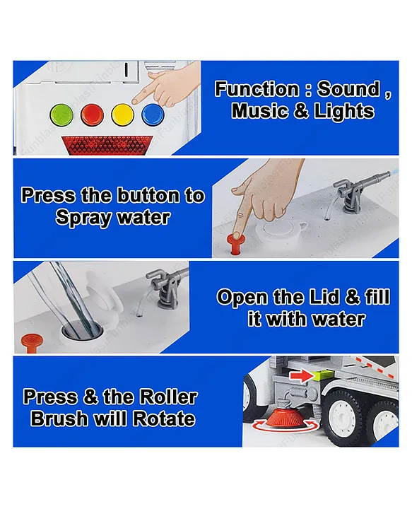 FunBlast Road Sweeper Truck Toy with Light & Sound 1 Pc Random Color Product Information Specifications, Package InfoKey FeaturesMake and Durability HighestQuality ABS Plastic. NON-TOXIC and SAFE.Light sound and melodious hornsound, reverse, siren sound realistic engine start soundThis Toy have extra grip highquality tire can crawl easilyHow To Use Open the lid of truckand fill it with water, then press the button to spray water. To rotate the rollerbrush, press the button given below.FunBlast kids toy truck isdurable enough to withstand heavy use without breaking or chippingBest return gifts for kids and yourloved ones. birthday gift for children, can be gifted on any occasion.