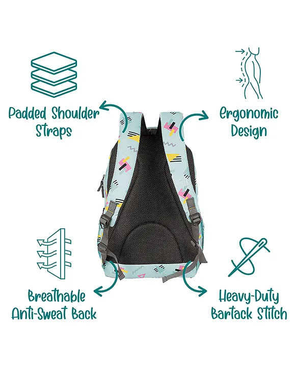 JUST BAGS JUSTBAGS School Backpack with 3 Spacious Compartments Geometric Mint 17 inches Features:Spacious 3 main compartments, 1 Front Pocket for essentials and 2 sidepockets.Premium 420D polyester fabric which is Ultra-Light weight, WaterResistant, Durable and easy to maintain.World 1 YKK zippers and reinforced Heavy Duty ‘Bartack Stitch’ on keystress points ensures strength, reliability and longevity.Thick padded Back System help maintain back posture. The shoulder strapsare adjustable and well-padded to provide equal weight distribution.18 months Warranty against any manufacturing defect.Specifications:Brand : JustbagsAge : 6 to 9 YearsType : Children School BackpackMaterial : 420D Polyester Fabric Body Specification:No. of compartments : 3 main compartments + 2 side pockets + 1 FrontPocketClosure Type : ZipAdjustable Straps – YesWater Resistant – Yes Physical Measurements:Dimensions: L 28 x B 20.3 x H 43 cmBag height – 17 Inches Product Description:This lightweight school bag is ideal for students studying in 2nd-3rdgrade. It has 2 side pockets for carrying bottle. It has a 25 ltrs storagecapacity with 3 main compartments along with 1 front pocket. The attractivedesign of this bag is sure to grab a lot of attention, at the same time it isbuilt to provide ultimate comfort to your kid. High quality polyester fabricand overall make of this stylish backpack will ensure you won’t have to lookfor another bag for a long time. Items Included in Package:Country of Origin: India