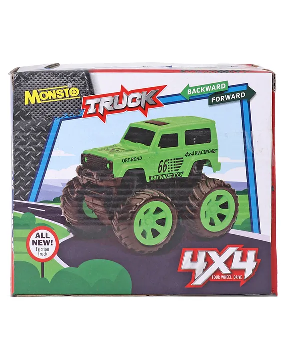 Monsto Monster Friction Monster Toy Truck Green Product Information Specifications, Package InfoKey FeaturesMade of non toxic and safe plastic materialHas smooth and non- edge surfaceThe truck is made of plastic tyres offering a smooth movement. Ideal as a decorative piece, this truck has a very smooth movement. Keeping in mind the children’s safety, innovative designs, and high manufacturing standards.The Monster truck ensures maximum safety and durability. It will be a perfect toy for your kid to play with and will surely be a wonderful addition to your kid’s toy collection. It will become your kid’s favourite in no time, so make your little one happy and see the smile on the face by gifting this car.Specifications