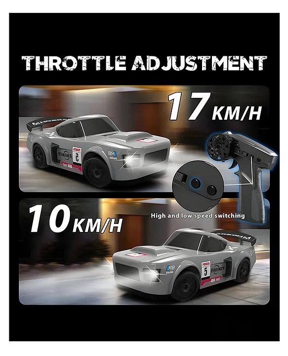 NEGOCIO Break Racing The Dawn 1:24 Drift RC Car 4WD Remote Control LED Light Car PACK OF 1 COLOR MAY VARY This drift car comes fully equipped with a 2.4G remote control system, ensuring precise control and responsiveness. The ABS shell provides durability, while the carbon brush strong magnetic motor offers impressive powerDesigned with a scientific chassis, this RC car excels in drifting. The independent spring shock absorber and full vehicle ball bearing ensure smooth operation, making every drift seamless and excitingThis RTR (Ready to Run) version comes with a rechargeable lithium battery and USB charger and its battery overcharge protection and overcurrent protection functions safeguard the internal electronic components, ensuring longevity and reliable performanceThe 2.4G remote control system offers a fantastic control experience, allowing you to maneuver the car forward, backward, left, and right with ease. The controllable front and rear lights add a realistic touch, making nighttime racing just as thrilling. With speeds reaching up to 20km/h, this car guarantees endless funThis mini rc drift car comes beautifully boxed, Ideal as a gift for RC modelers & friends & family during festivities eg Christmas BirthdaySpecification:Brand: NEGOCIOType: RC ToyAge: 6 Yrs+Dimension: L 18.9 x B 8.9 x H 6.5 cmMaterial: Plastic