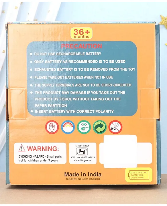 Specifications:Brand- Aarohi ToysType- Musical Soft ToyAge- 3 Years+Box Dimension- L 20 x B 10 x H 19.5 cmOverall Dimension- L 17 x B 9.5 x H 14 cmBattery Information- AA 1.5 VolMusic- YesWeight – 380 g