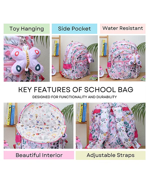 Rosada Lilac Garden Light Weight Durable School Bag with Comfortable Cushion Padding Waterproof Trendy and Spacious Kids Backpack Unisex Stylish Bag for Kids Boys and Girls Small (11 Inches) Features:Two Main Compartments: Ample space for books, notebooks, and more.Front Compartment: Perfect for storing smaller items like pencils, snacks, or a lunch box.Bottle Holders: Convenient side pockets for carrying water bottles.Durable Material: Built to withstand daily use, ensuring long-lasting performance.Adjustable Straps: Provides a comfortable fit for kids of all sizes. Specifications:Brand – RosadaType – School BagAge – 18 months to 3 YearsProduct Dimensions – L 25 x B 14 x H 28 cm
