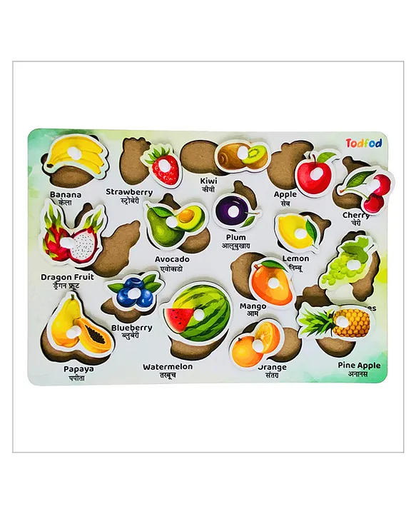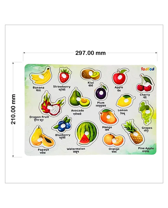 Wooden Fruits Puzzle With Knob Multicolour 16 Pieces Features:· TodFod’s Toys helps you to teach the kids about different types ofAnimals, Numbers, Alphabets, Shapes using this puzzle, it helps the children tolearn faster than the books. it will be a best source for pre school kids tostart their journey with fun and learning.· HOW TO USE – Lay out the pieces in front of your child. Ask your childto build one letter at a time, showing them that each piece has an animal thatbegins with the corresponding letter!· GREAT GIFT – The mini puzzles make the perfect gift for ages 3 to 6! Itis an excellent puzzle set for children to develop their observation, finemotor & logical reasoning skills.· Made of 100% safe wooden material. Specifications:Brand -TodfodType -Peg & Knob Puzzle AlphabetsMaterial Wooden MDFManufacturer’sRecommended Age – 2 Years +ProductDimensions – L 30 x B 20 x H 1.5 cm Product Description:An educational puzzle is a learning tool designed to engage andchallenge individuals, typically students, while imparting knowledge ordeveloping cognitive skills Educational puzzles are designed to capture thelearner’s attention and interest, making the learning process enjoyable. Theycan be colorful, visually appealing, and incorporate engaging images orillustrations related to the educational topic.