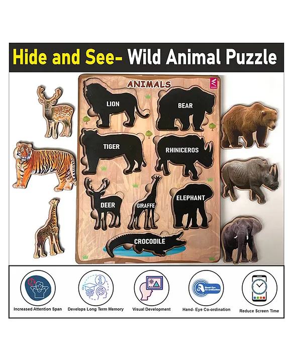 Wooden Hide and See Wild Animals Puzzle 10 Pieces FeaturesColorful & Engaging Design: The bright colors and playful graphics capture children’s attention and help them visualize objects and remember information more effectively.Holistic Development: Playing with the puzzle promotes the development of various skills, including:Hand-eye coordination and fine motor skills: Placing the pieces in the correct slots strengthens these crucial skills.Cognitive ability and problem-solving skills: Children need to think strategically to find the correct matches, fostering their cognitive development.Social and emotional learning: Encourages interaction and collaboration when playing with friends, promoting social skills and emotional development.Memory skills, observation, phonetic awareness, and color patterns: The game design helps strengthen various cognitive and learning abilities.Safe and Sustainable:Made with 100% eco-friendly and child-safe materials: We use non-toxic, carb-compliant MDF wood and 100% non-toxic prints for your child’s safety.Smooth, curved edges for worry-free playtime.Durable construction: Both the board and puzzle pieces are made from sturdy 3mm MDF for lasting enjoyment.