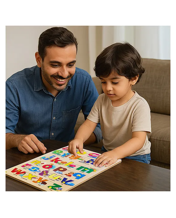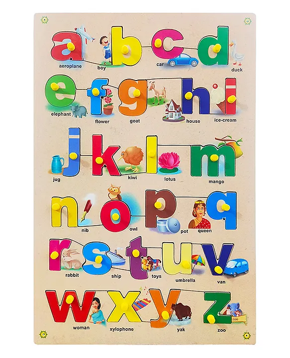 Wooden Small ABC Identification Puzzle with Knob and Illustration Big Tray Multicolour Features:1. Learn a to z with Fun Pictures Features all 26 alphabets with colourful illustrations (a for aeroplane, b for boy, c for car, etc.) to make letter learning engaging and easy for kids.2. Easy-to-Grip Peg Handles Each alphabet piece includes a sturdy peg, perfect for small hands to lift and place, enhancing fine motor skills and hand-eye coordination.3. Educational & Interactive Play Encourages letter recognition, vocabulary building, memory development, and cognitive learning through fun, hands-on activity.4. Safe & Durable Wooden Build Made from premium-quality wood with smooth, rounded edges and non-toxic colours, ensuring safe play for young children.5. Large Play Board The 45 cm x 30 cm x 0.8 cm board offers a spacious layout for easy handling and visual clarity, ideal for toddlers aged 2 to 6 years.