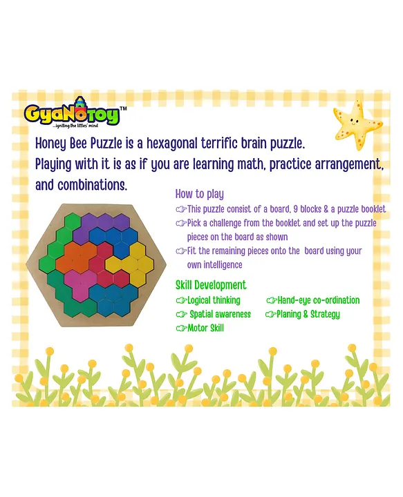Product Description:Tangram is a dissection puzzle, consisting of seven geometric shapes/blocks, called tans. These blocks are put together to form various shapes. It is one of the most widely recognized dissection puzzles in the world and has been used for various purposes including amusement, art, and education. Playing with these blocks enhances child’s hand-eye coordination as they form different shapes using these blocks. The honey bee puzzle is a hexagonal puzzle consisting of 9 pieces in different colors, and 1 board and it comes with a booklet consisting of 60 puzzles in low, medium & high difficulty levels to solve. The game is played by placing a few of the blocks into the puzzle board as depicted in the puzzles and filling the remaining blocks using one’s own intelligence to solve the puzzle. The different shape blocks make a terrific brain puzzle, not only limited to the instructions but also trying to figure out more solutions to make a fantastic play. This puzzle game help the child develops & promotes creativity, and patience, cultivates confidence and improves the psychological quality. This improves hand and eye coordination and fine motor skill. These blocks come in a range of bold, rainbow colors. This puzzle is made from high-quality, responsibly sourced environment-friendly materials and will make a beautiful and stylish addition to your home, home school, classroom, playroom, nursery decor, or your Montessori shelf!